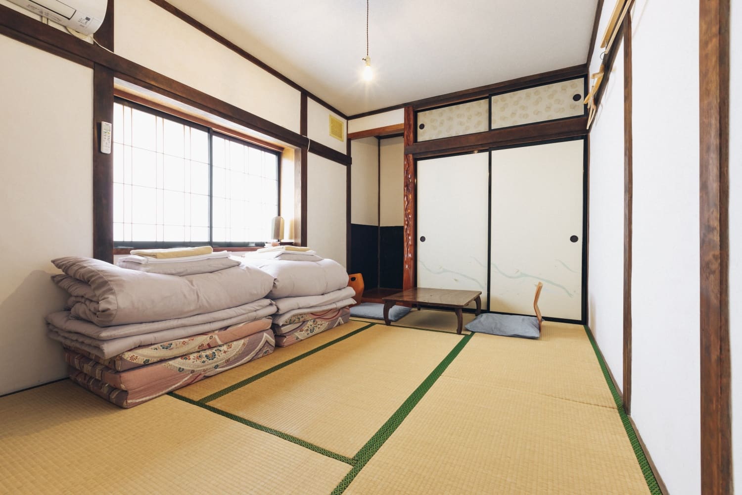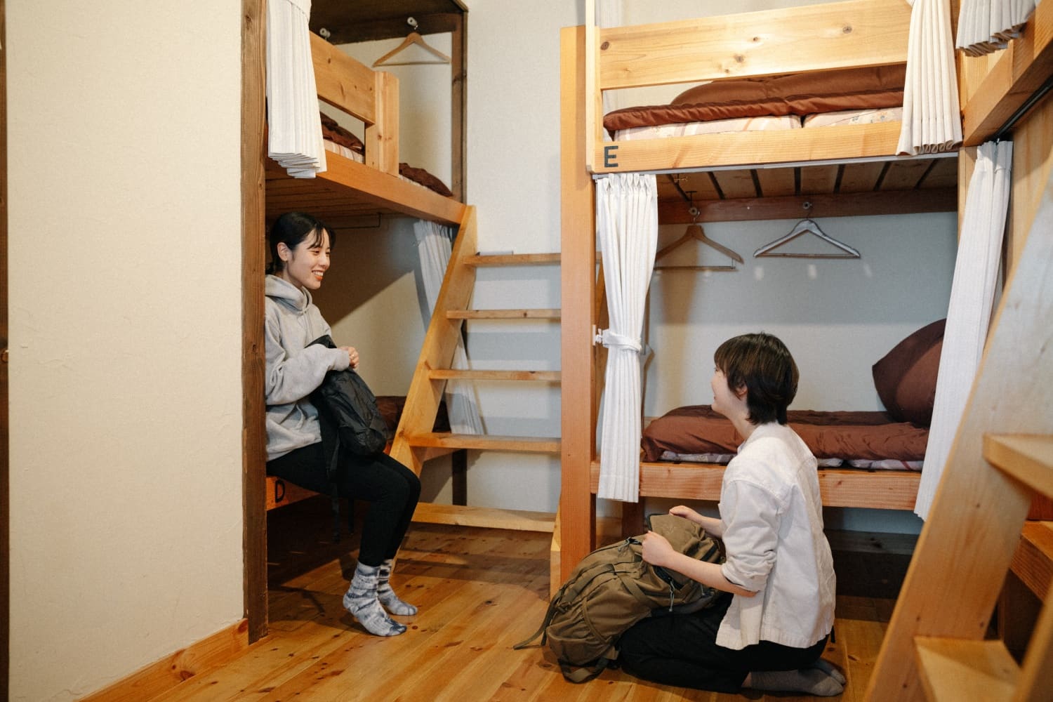 Spacious dormitory rooms with high ceilings and bunk beds, which bring back childhood memories. Private rooms with Tatami flooring and Japanese plaster walls (traditional style).