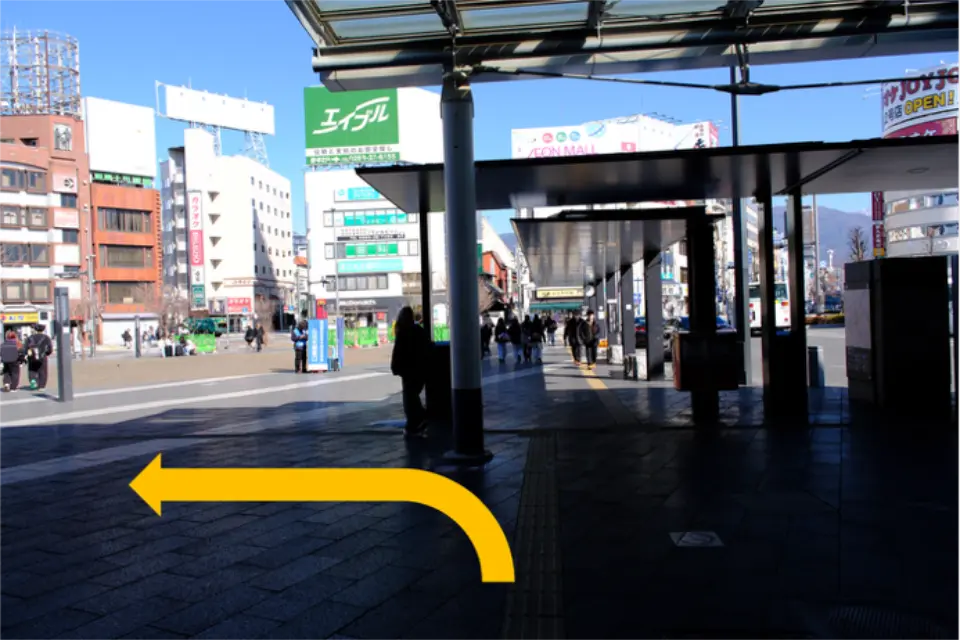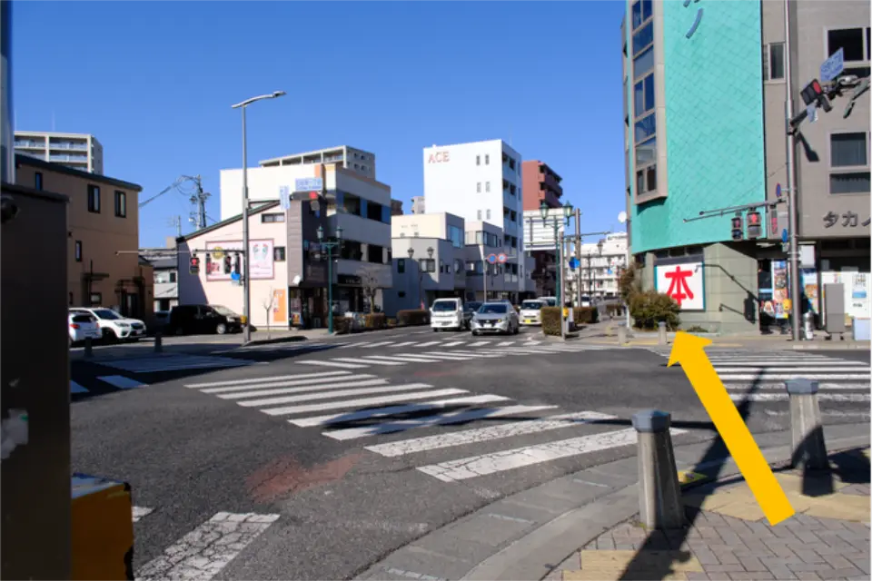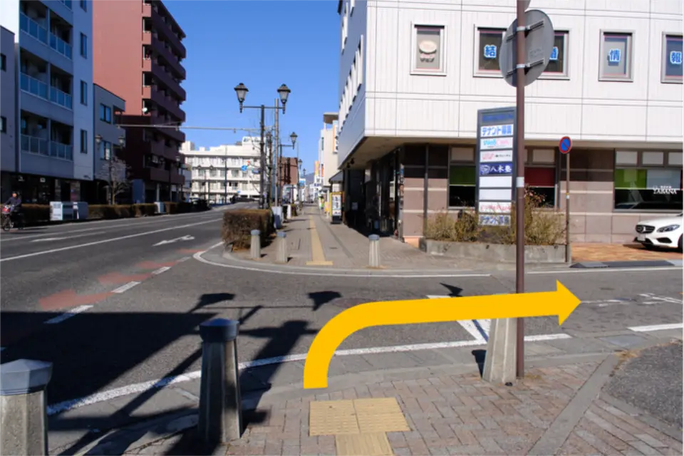 ④「中央一丁目」の信号を渡り、次の角(信州伊酒YABANAの建物手前)を右に曲がる。